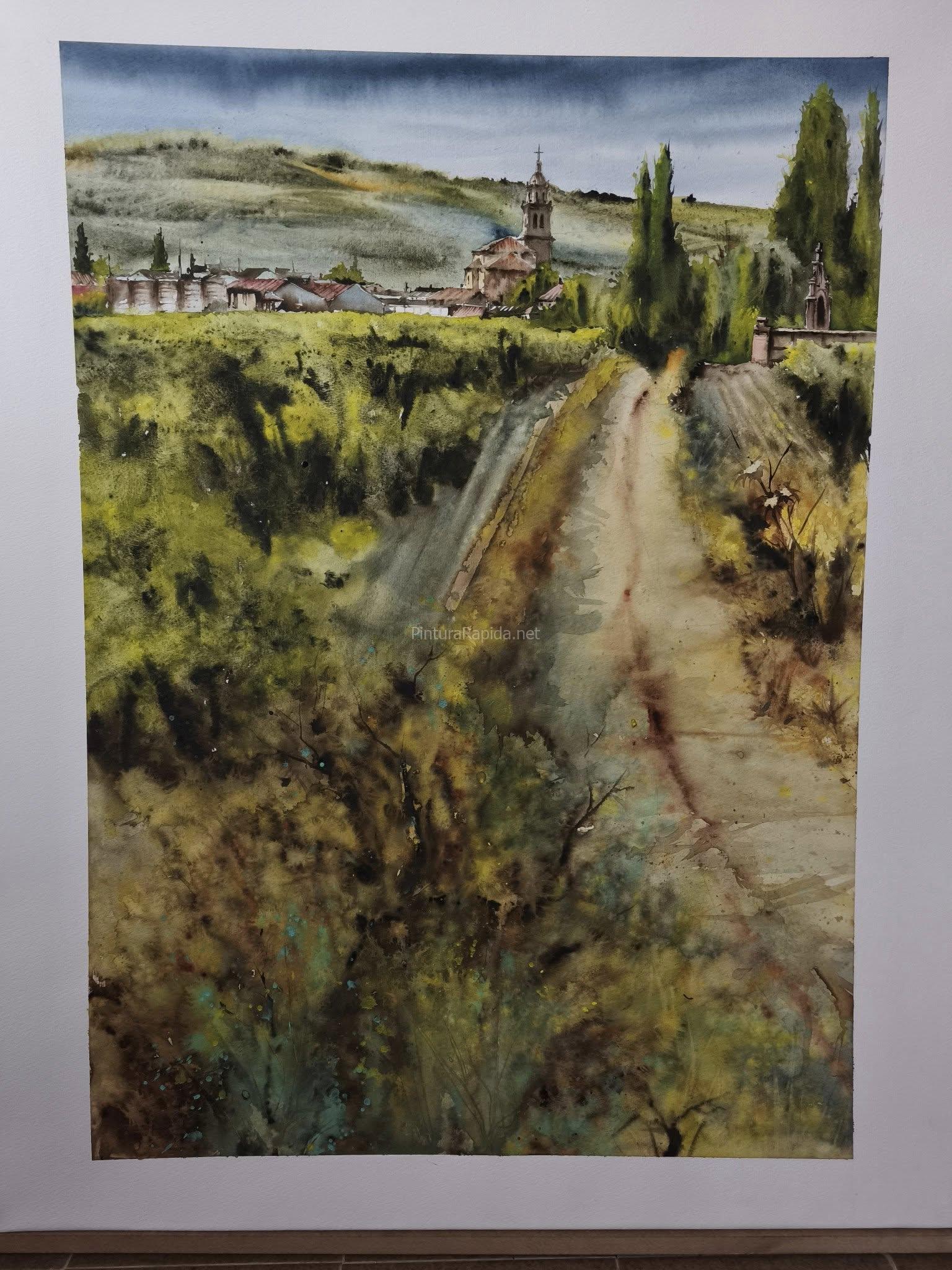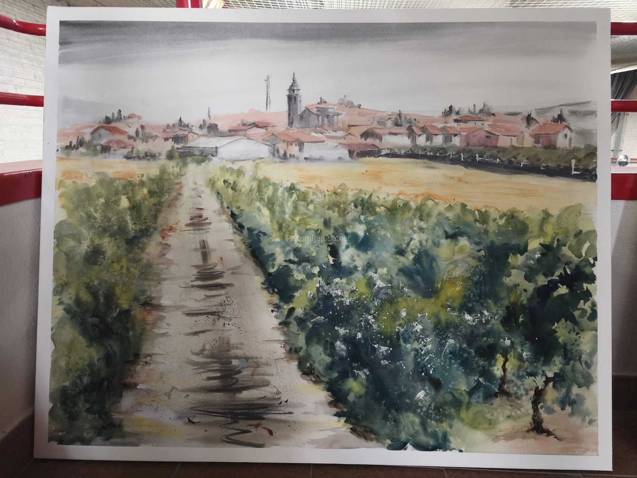 En segundo lugar, con un premio de 450 euros, ha sido reconocida Marisol De Marcos Miguel, que ha pintado una senda rural flanqueada por viñas y campos en tonos ocres, con la localidad al fondo, capturando el alma paisajística del entorno vitivinícola.