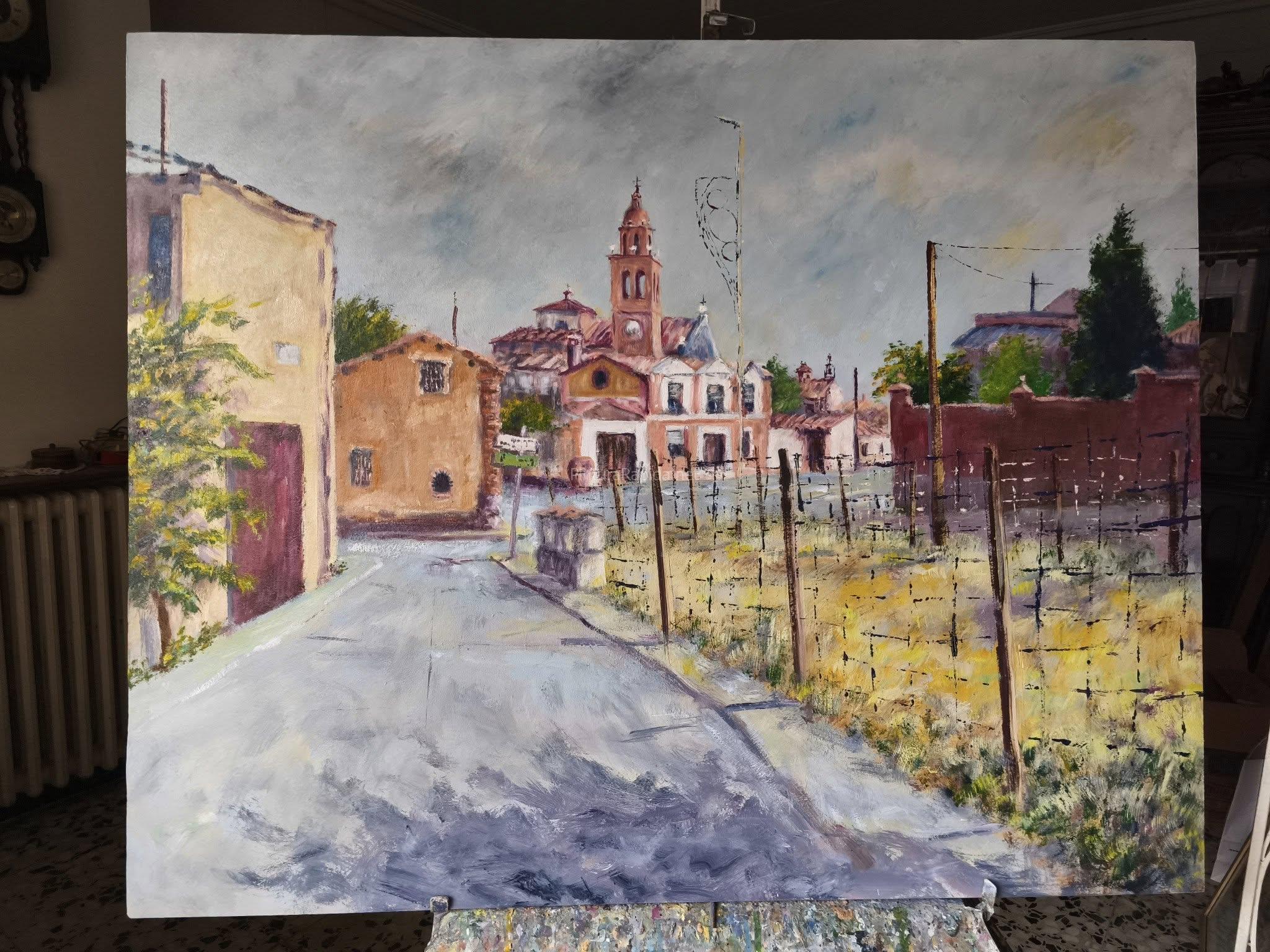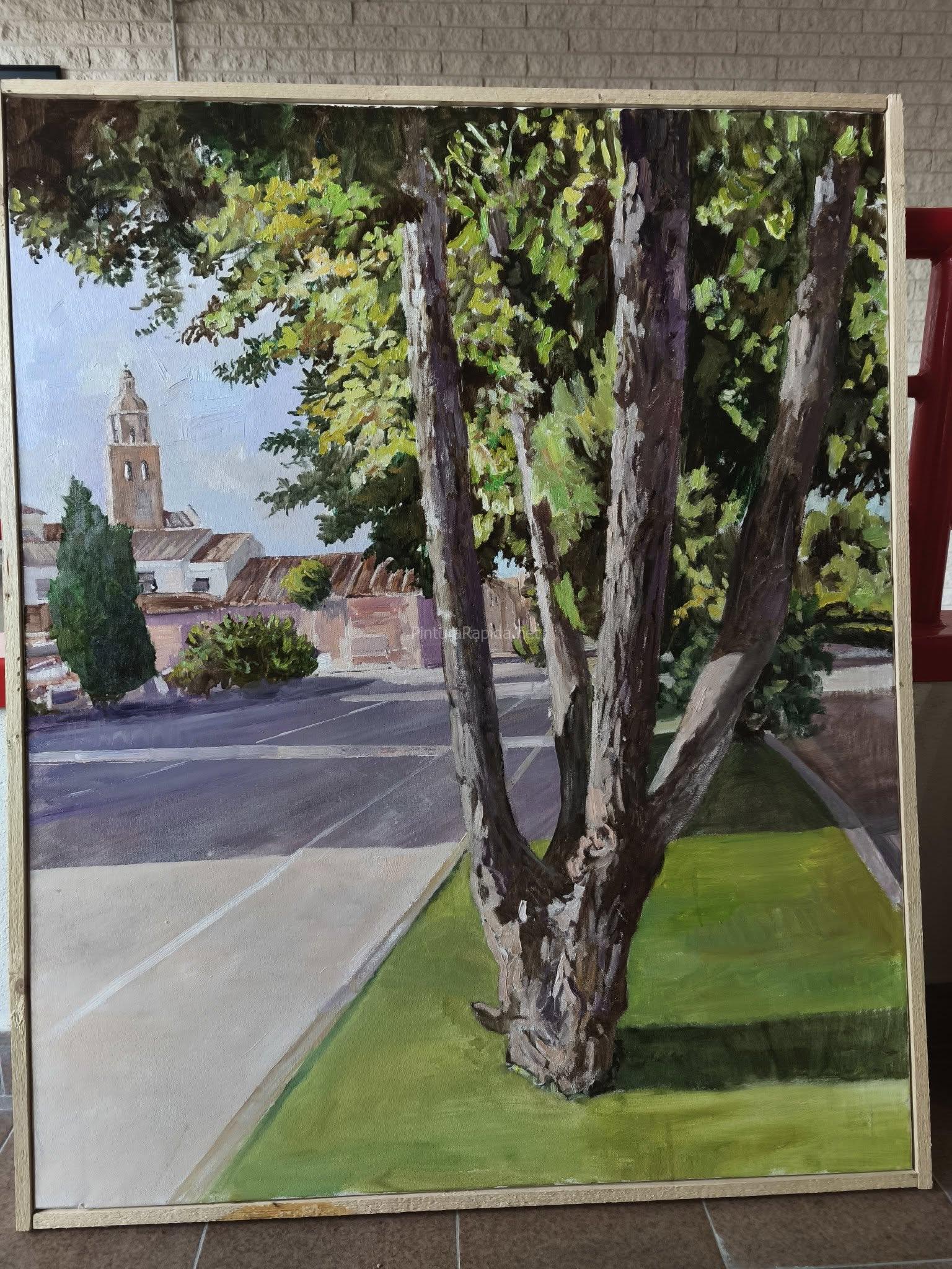 El primer premio, dotado con 600 euros, ha sido para Francisco Tomás, cuya obra presenta una cuidada composición con una arboleda en primer plano y una vista en profundidad del pueblo, donde destaca la silueta de la iglesia bajo una atmósfera luminosa y serena.