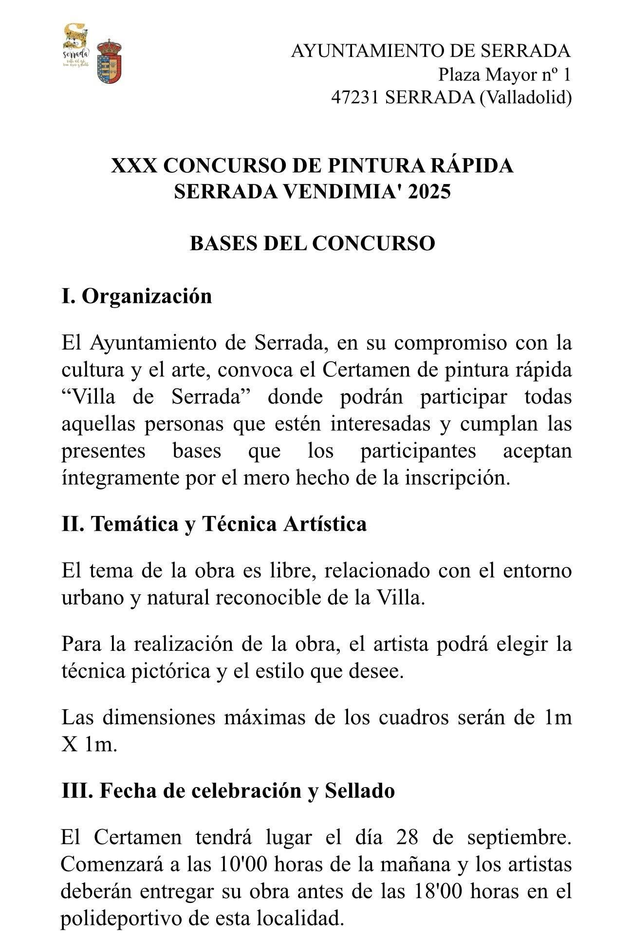 El Ayuntamiento de Serrada, en su compromiso con la cultura y el arte, convoca el Certamen de pintura rápida “Villa de Serrada” donde podrán participar todas aquellas personas que estén interesadas y cumplan las presentes bases que los participantes aceptan íntegramente por el mero hecho de la inscripción.