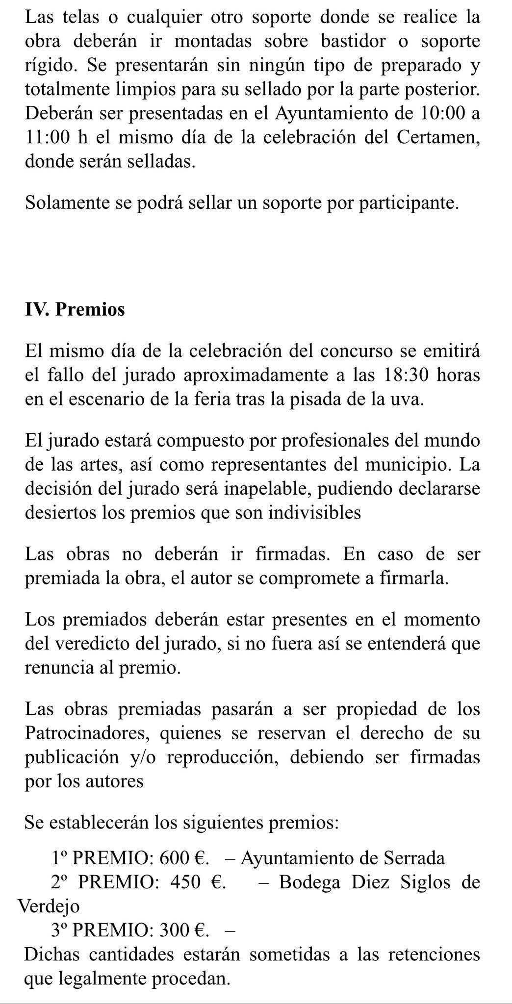 Las telas o cualquier otro soporte donde se realice la obra deberán ir montadas sobre bastidor o soporte rígido. Se presentarán sin ningún tipo de preparado y totalmente limpios para su sellado por la parte posterior. Deberán ser presentadas en el Ayuntamiento de 10:00 a 11:00 h el mismo día de la celebración del Certamen, donde serán selladas.