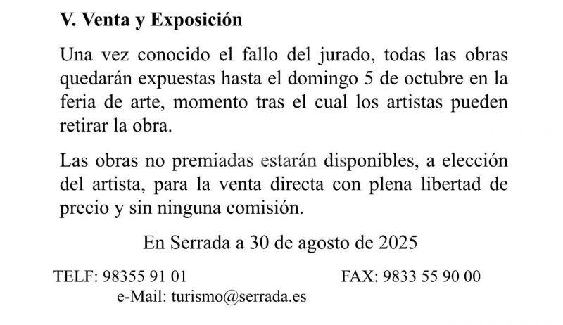 Las obras no premiadas estarán disponibles, a elección del artista, para la venta directa con plena libertad de precio y sin ninguna comisión.