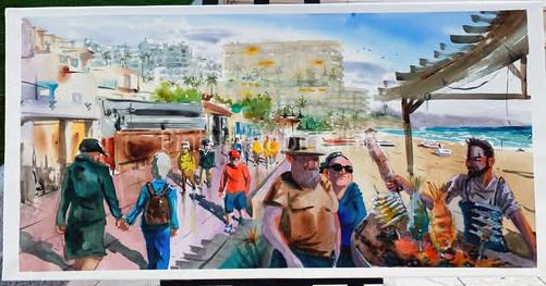 El primer premio fue para José Luis Ocaña, autor de una colorida y dinámica obra que representa una escena costumbrista de La Carihuela con bañistas, paseantes y un espetero junto a la playa. La acuarela, llena de vida y movimiento, destaca por su riqueza cromática y su fidelidad al ambiente marinero del entorno.