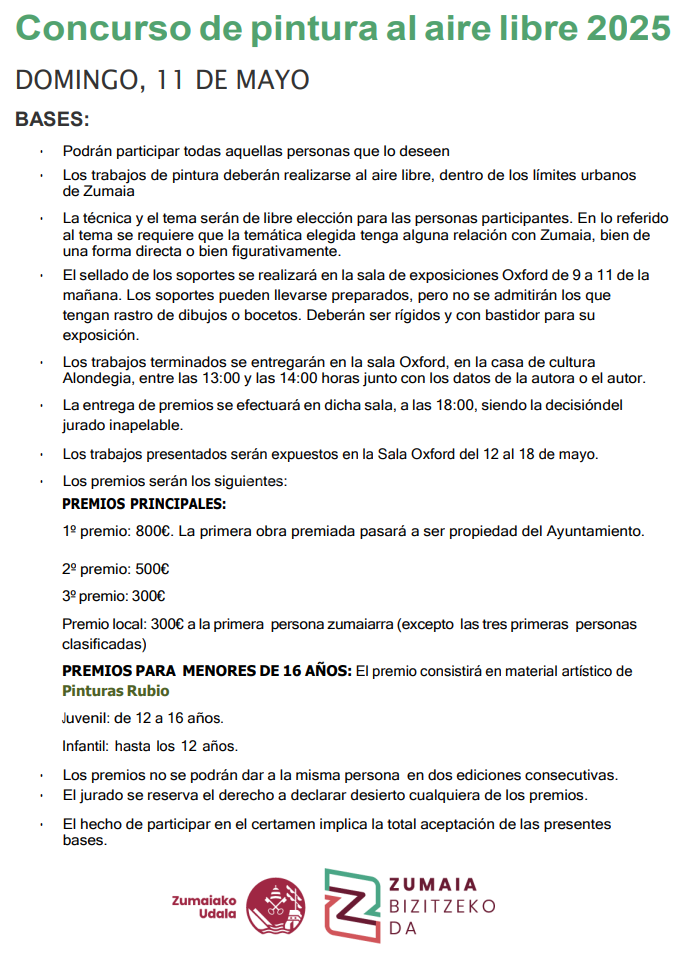 Los trabajos de pintura deberán realizarse al aire libre, dentro de los límites urbanos de Zumaia.