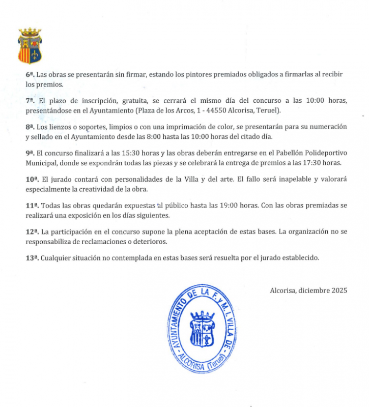El Excmo. Ayuntamiento de la Fiel y Muy Ilustre Villa de Alcorisa (Teruel) convoca el XXX Certamen Internacional de Pintura Rápida al aire libre “José Aced”, que se celebrará el domingo 18 de enero de 2026, en el que podrán participar pintores nacionales y extranjeros, de acuerdo a las siguientes bases: