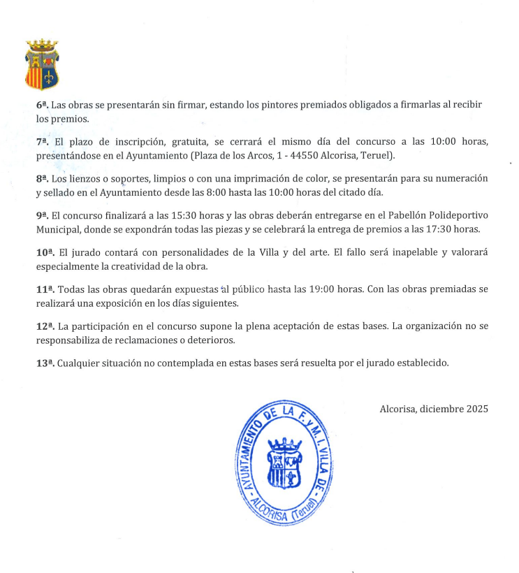 El Excmo. Ayuntamiento de la Fiel y Muy Ilustre Villa de Alcorisa (Teruel) convoca el XXX Certamen Internacional de Pintura Rápida al aire libre “José Aced”, que se celebrará el domingo 18 de enero de 2026, en el que podrán participar pintores nacionales y extranjeros, de acuerdo a las siguientes bases: