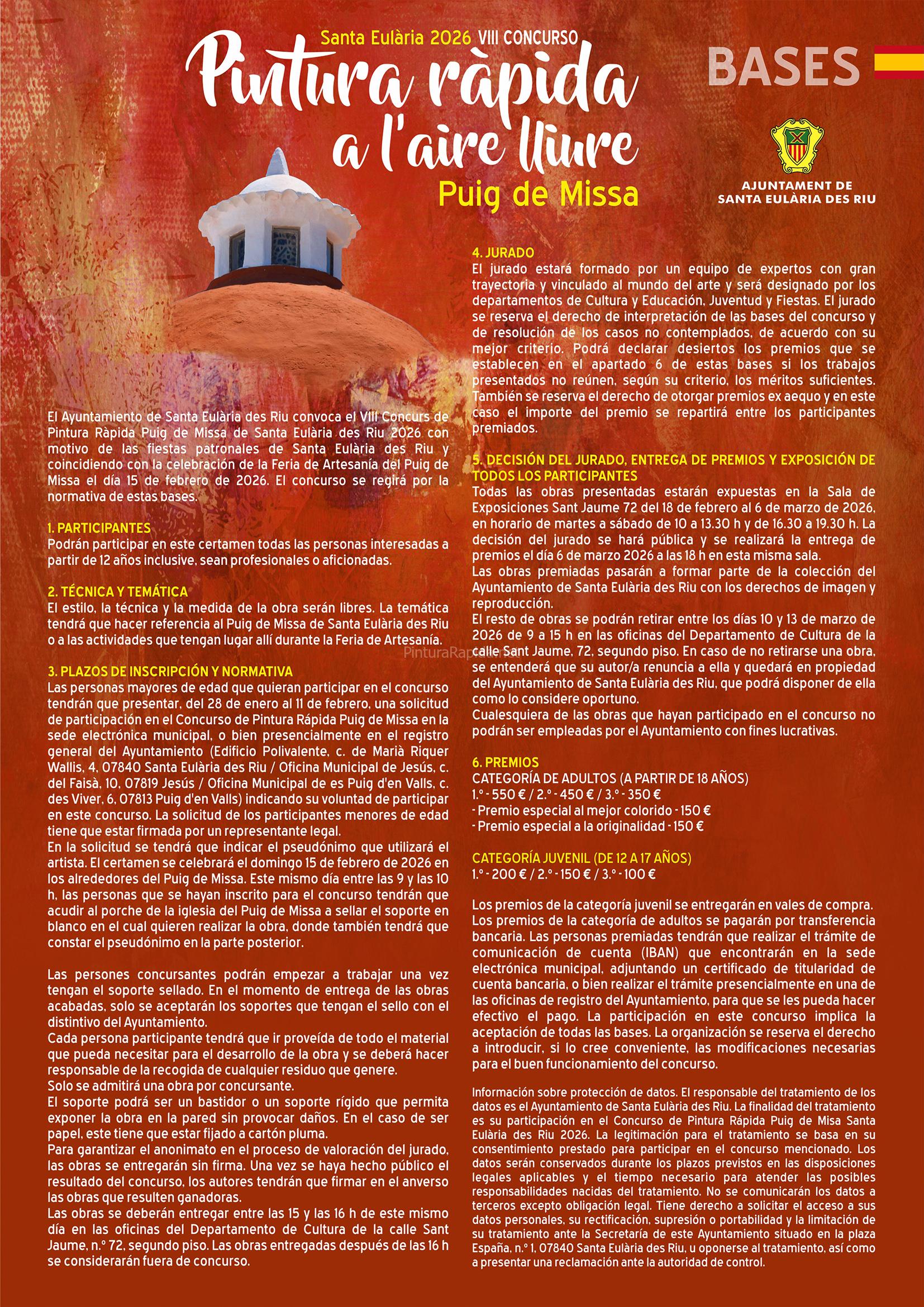 Información sobre protección de datos. El responsable del tratamiento de los datos es el Ayuntamiento de Santa Eulària des Riu. La finalidad del tratamiento es su participación en el Concurso de Pintura Rápida Puig de Missa Santa Eulària des Riu 2026. La legitimación para el tratamiento se basa en su consentimiento prestado para participar en el concurso mencionado. Los datos serán conservados durante los plazos previstos en las disposiciones legales aplicables y el tiempo necesario para atender las posibles responsabilidades nacidas del tratamiento. No se comunicarán los datos a terceros excepto obligación legal. Tiene derecho a solicitar el acceso a sus datos personales, su rectificación, supresión o portabilidad y la limitación de su tratamiento ante la Secretaría de este Ayuntamiento situado en la plaza España, n.º 1, 07840 Santa Eulària des Riu, oponiéndose al tratamiento, así como a presentar una reclamación ante la autoridad de control.