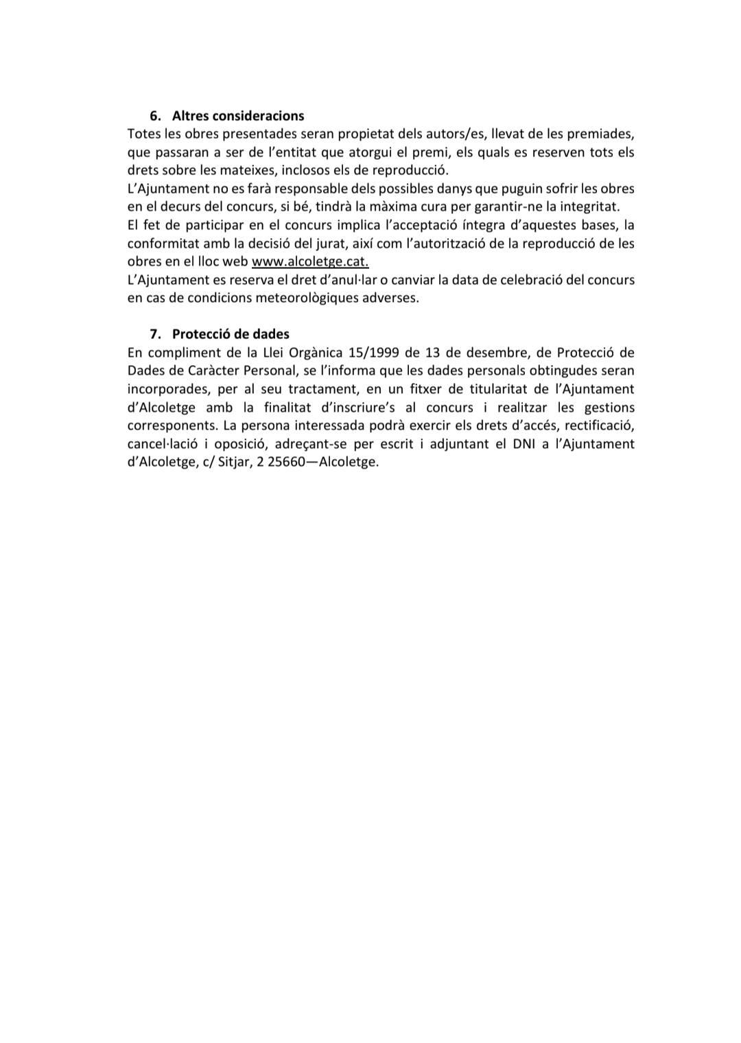 En cumplimiento de la Ley Orgánica 15/1999 de 13 de diciembre, de Protección de Datos de Carácter Personal, se informa que los datos personales obtenidos se incorporarán a un fichero del Ayuntamiento de Alcoletge con la finalidad de gestionar la inscripción al concurso.