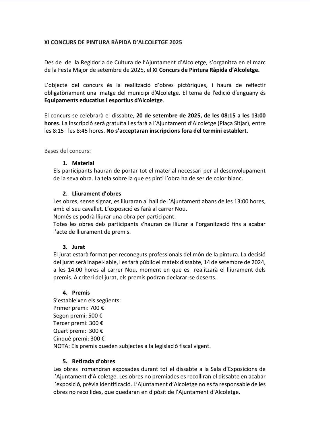 El Ayuntamiento de Alcoletge no se hace responsable de las obras no recogidas, que quedarán en depósito en el Ayuntamiento.