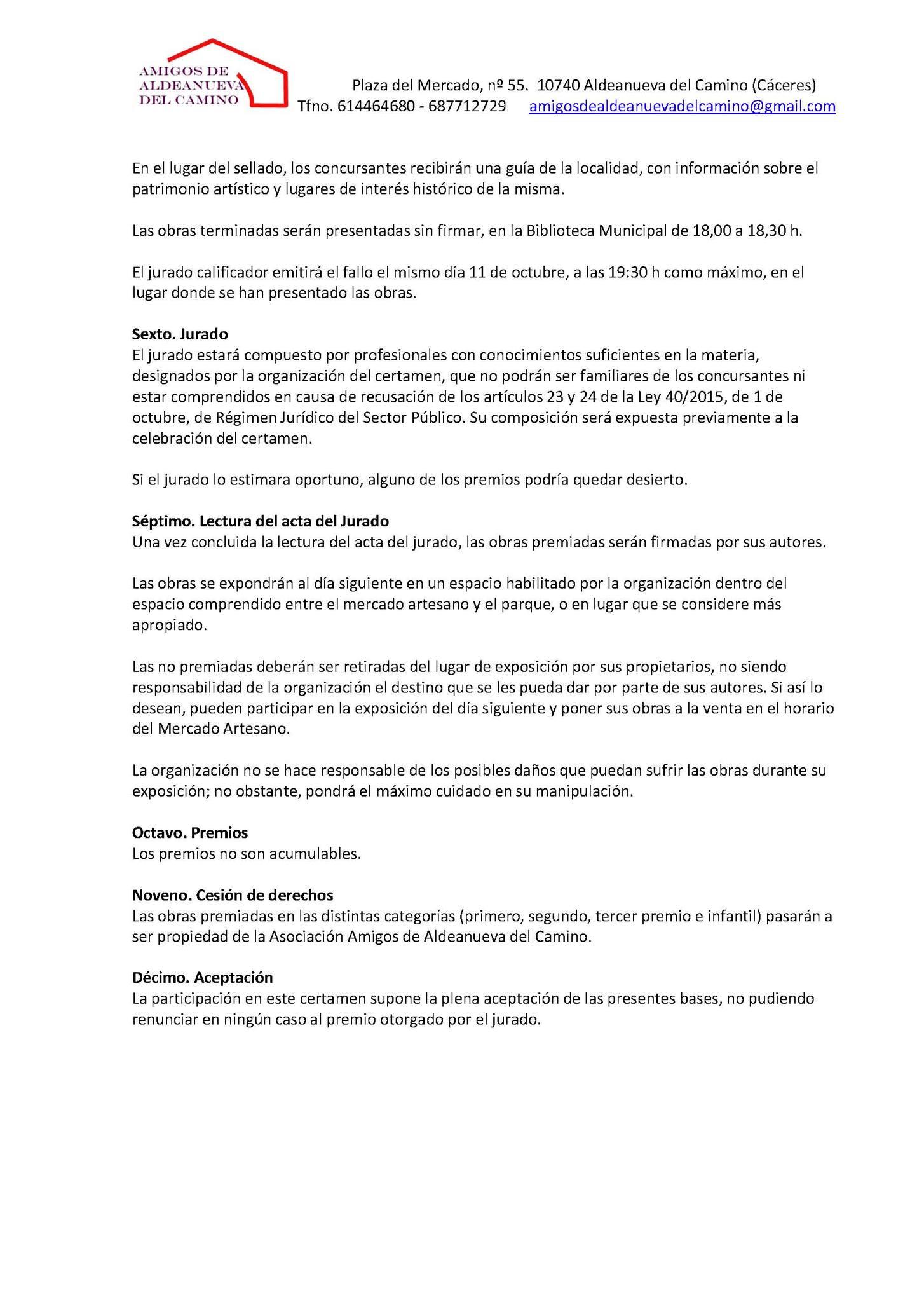 Las obras premiadas pasarán a ser propiedad de la Asociación Amigos de Aldeanueva del Camino, en todas las categorías.