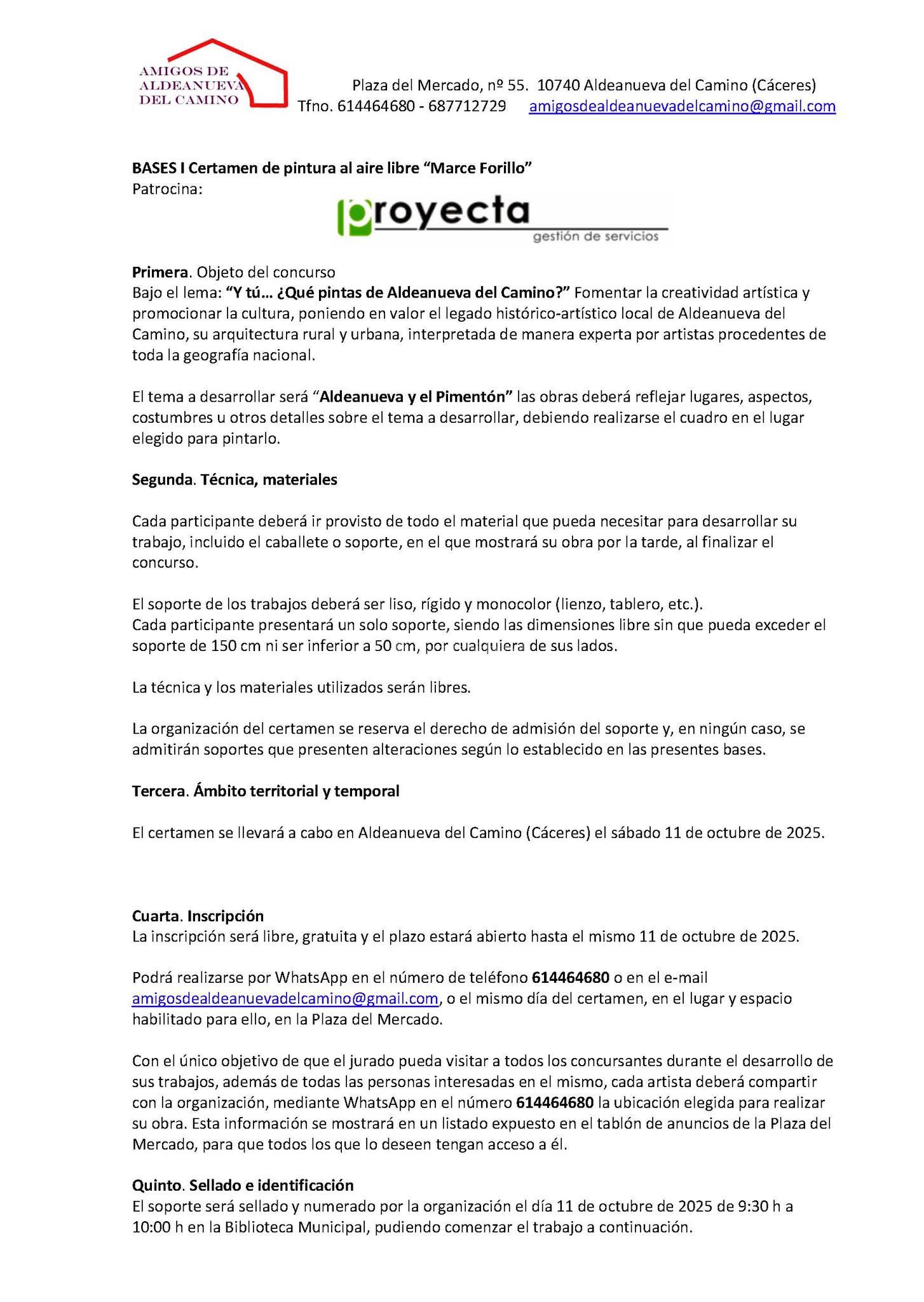 ⚠️ Para que el jurado pueda visitar las obras durante su ejecución, cada artista deberá comunicar por WhatsApp su ubicación, que se publicará en el tablón de anuncios de la Plaza del Mercado.