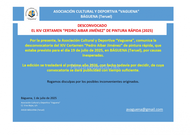 La Asociación Cultural y Deportiva “Vaguena” convoca el XIV Certamen “Pedro Aibar Jiménez” de pintura rápida, que se celebrará en Báguena (Teruel).
