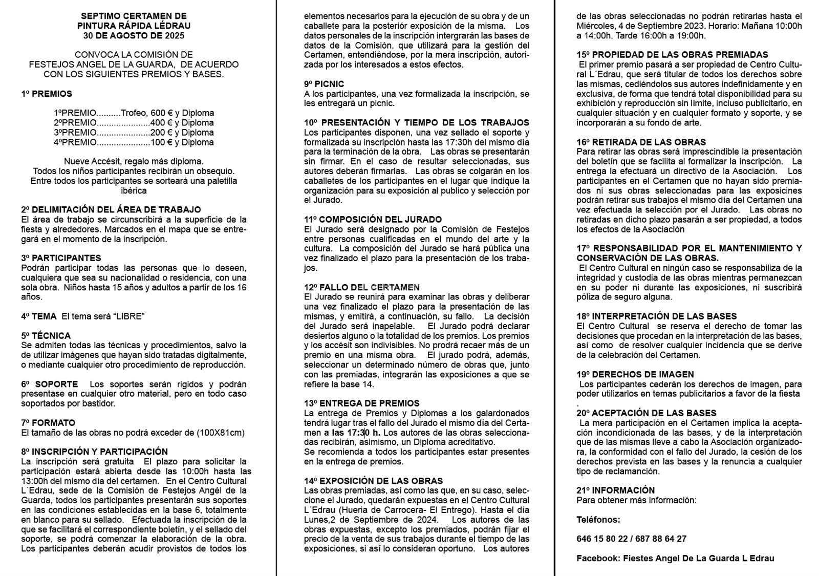 Premios: 600 € – 400 € – 200 € – 100 € – 9x accésit (regalo + diploma) – Infantil: obsequio – Sorteo: paletilla ibérica
