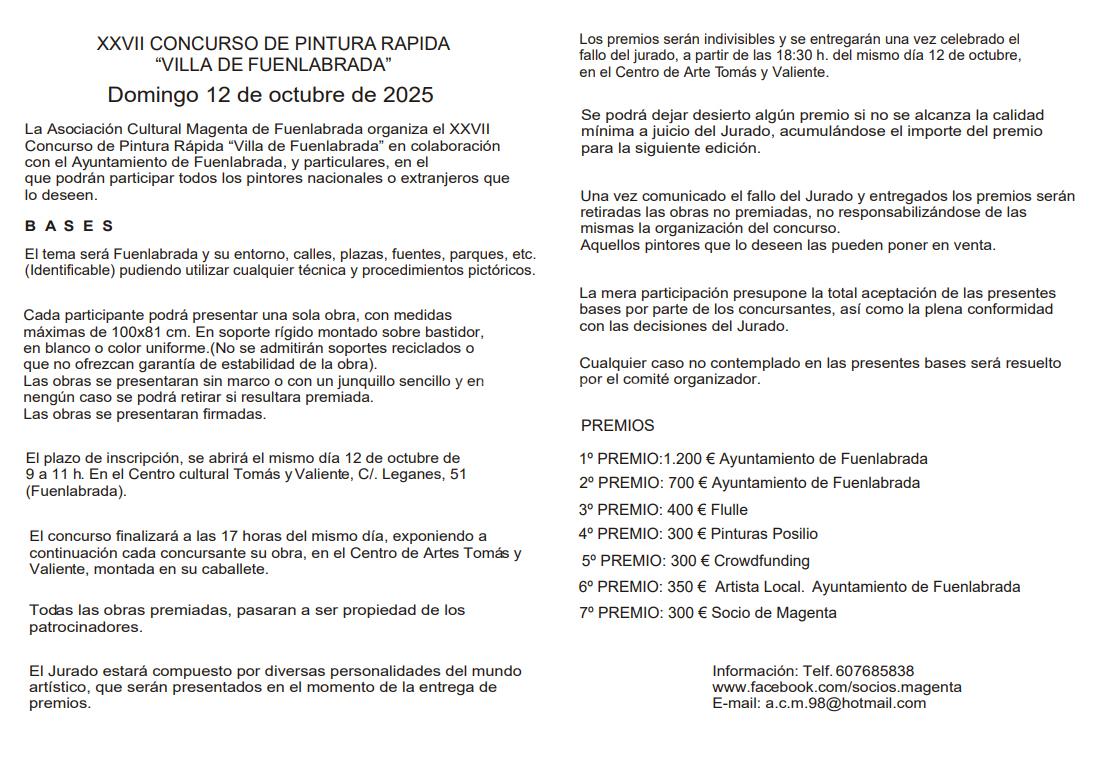La Asociación Cultural Magenta de Fuenlabrada organiza el XXVII Concurso de Pintura Rápida “Villa de Fuenlabrada”, en colaboración con el Ayuntamiento de Fuenlabrada y entidades particulares. Podrán participar todos los pintores nacionales o extranjeros que lo deseen.