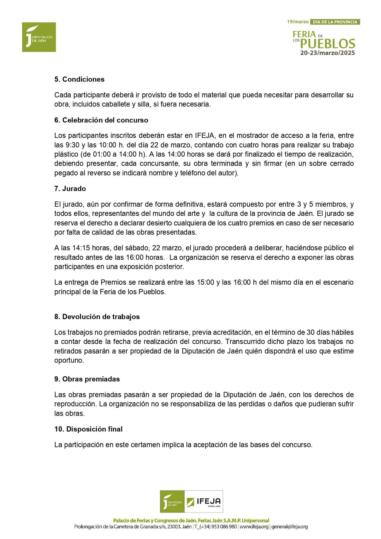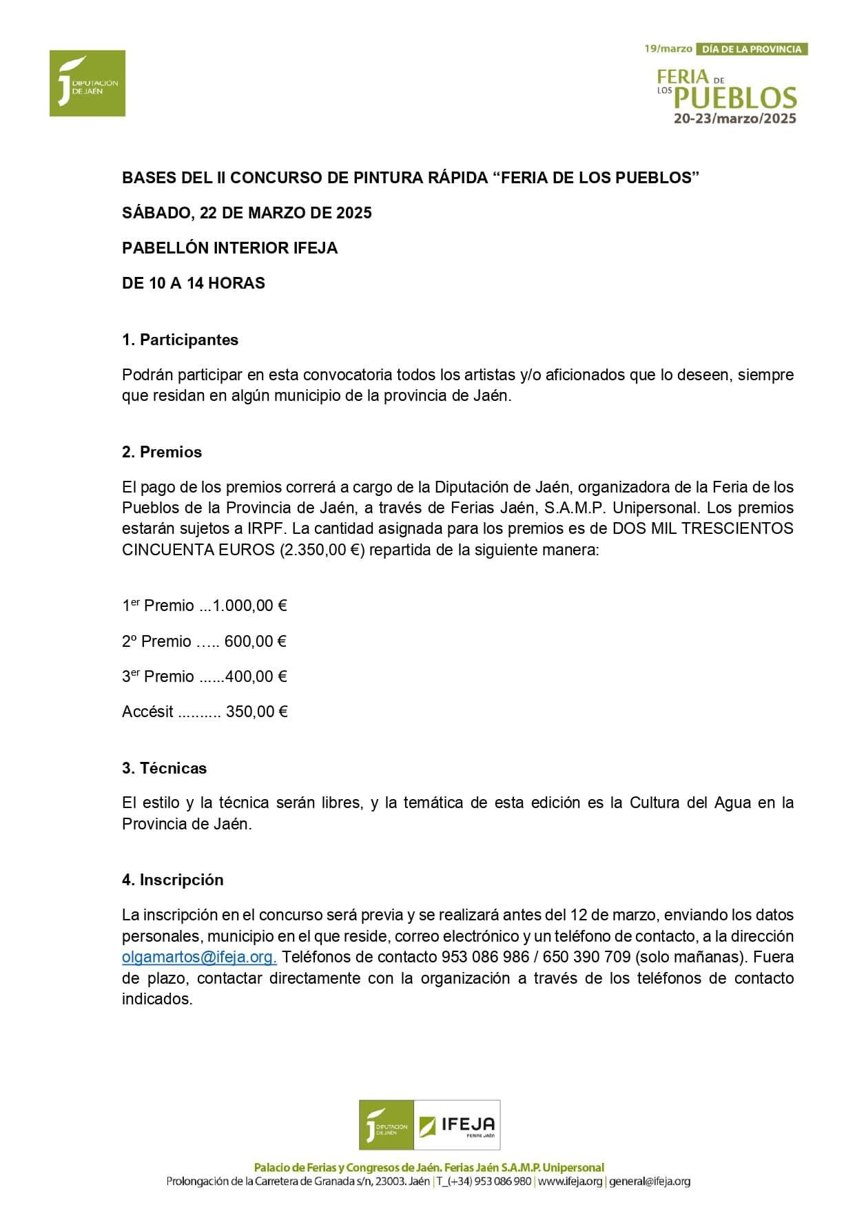 El pago de los premios correrá a cargo de la Diputación de Jaén, organizadora de la Feria de los Pueblos de la Provincia de Jaén, a través de Ferias Jaén, S.A.M.P. Unipersonal.