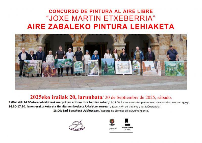 Arkatza Elkartea, con la ayuda del Ayuntamiento de Legazpi, convocan el Concurso de Pintura al Aire Libre “Joxe Martin Etxeberria”, para el 20 de septiembre del 2025. El Concurso se convoca con arreglo a las siguientes BASES: