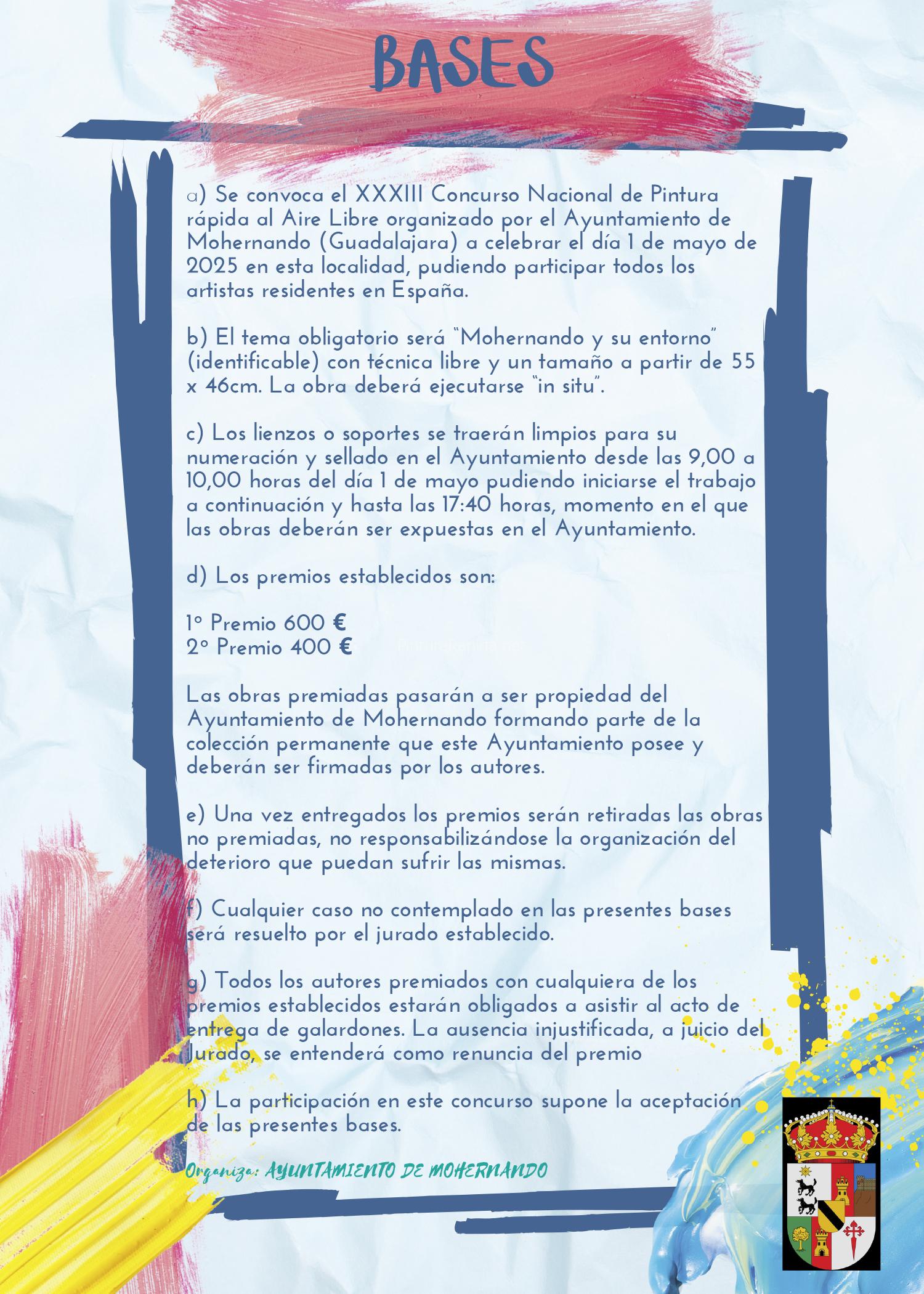 a) Se convoca el XXXIII Concurso Nacional de Pintura Rápida al Aire Libre organizado por el Ayuntamiento de Mohernando (Guadalajara), a celebrar el día 1 de mayo de 2025 en esta localidad, pudiendo participar todos los artistas residentes en España.