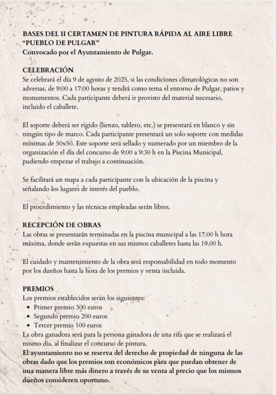Se celebrará el día 9 de agosto de 2025, si las condiciones climatológicas no son adversas, de 9:00 a 17:00 horas y tendrá como tema el entorno de Pulgar, patios y monumentos. Cada participante deberá ir provisto del material necesario, incluido el caballete.