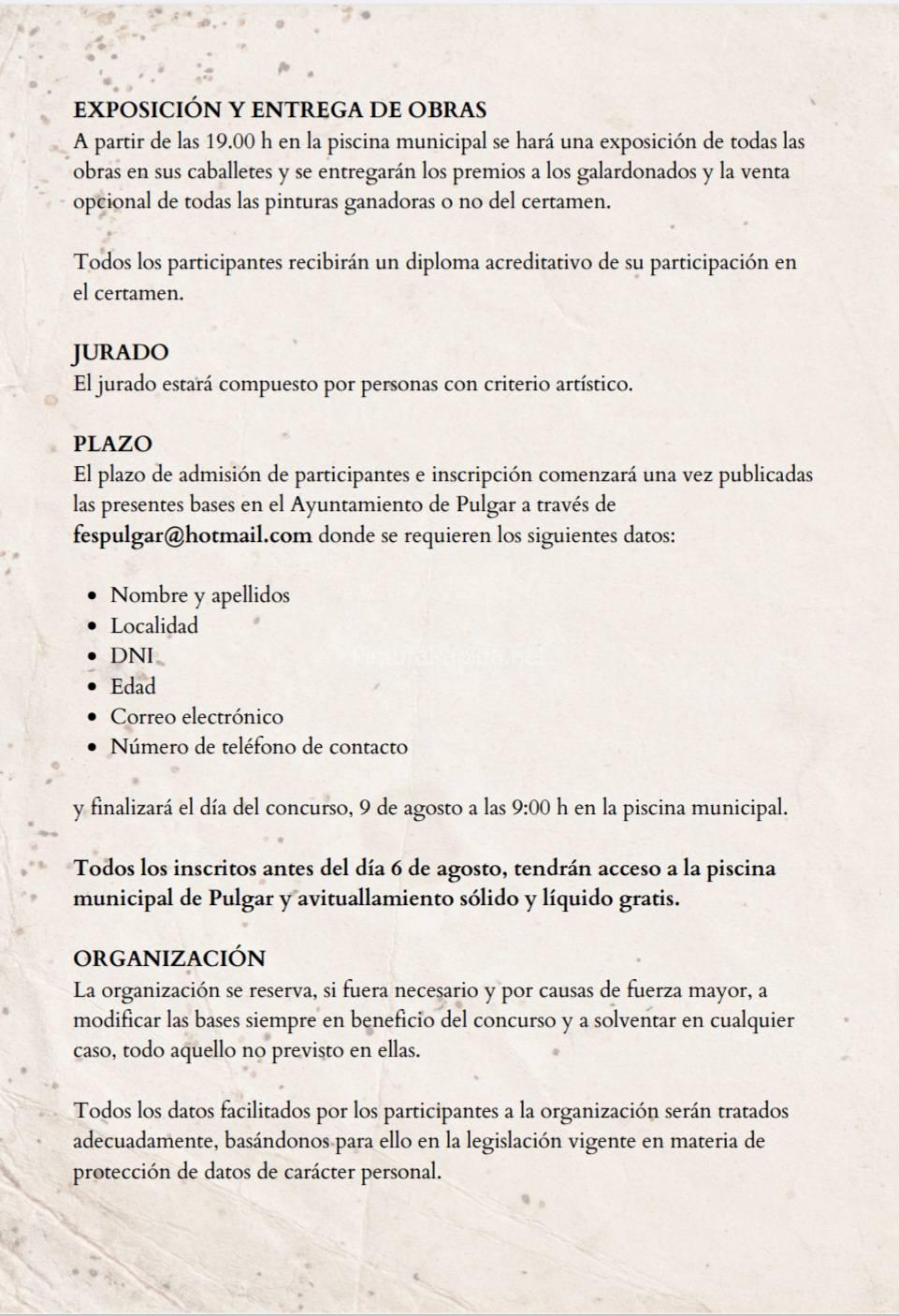 El plazo de admisión de participantes e inscripción comenzará una vez publicadas las presentes bases en el Ayuntamiento de Pulgar a través de fespulgar@hotmail.com donde se requieren los siguientes datos: