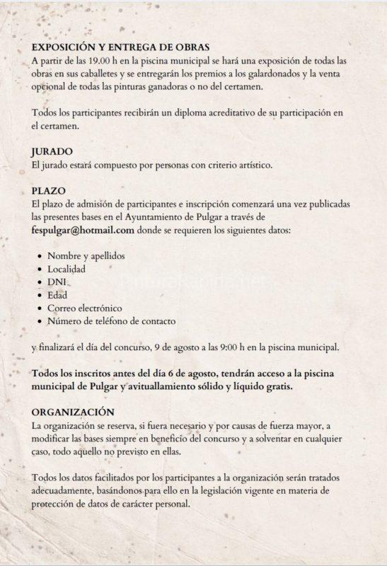 Se celebrará el día 9 de agosto de 2025, si las condiciones climatológicas no son adversas, de 9:00 a 17:00 horas y tendrá como tema el entorno de Pulgar, patios y monumentos. Cada participante deberá ir provisto del material necesario, incluido el caballete.