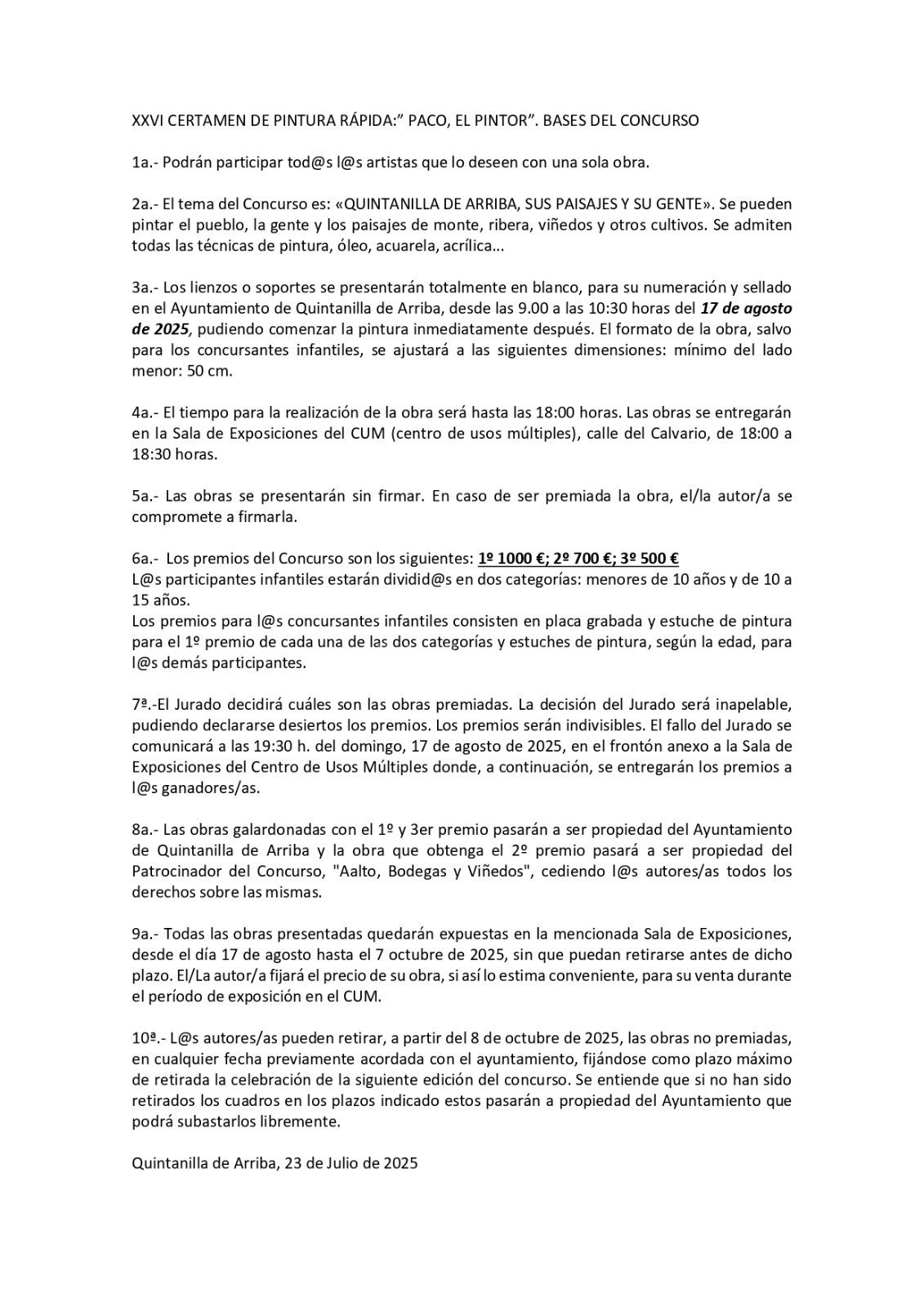 3ª.- Los lienzos o soportes se presentarán totalmente en blanco, para su numeración y sellado en el Ayuntamiento de Quintanilla de Arriba, desde las 9:00 a las 10:30 horas del 17 de agosto de 2025, pudiendo comenzar la pintura inmediatamente después. El formato de la obra, salvo para los concursantes infantiles, se ajustará a las siguientes dimensiones: mínimo del lado menor: 50 cm.