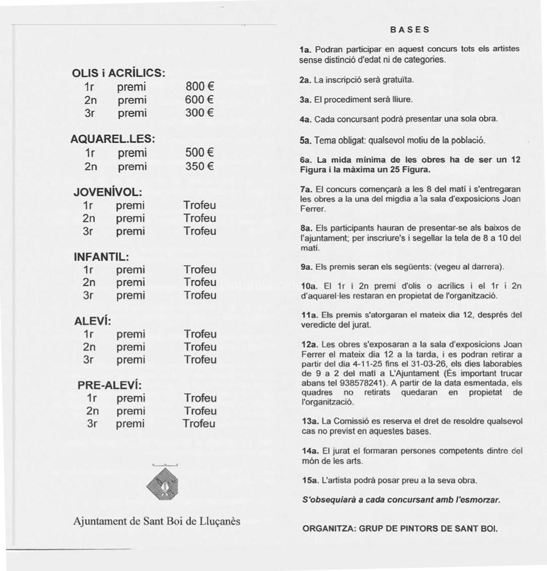 Las obras se expondrán en la Sala de Exposiciones Joan Ferrer el mismo día 12 por la tarde, y se podrán retirar a partir del 4 de noviembre hasta el 31 de marzo de 2026, de 9 a 14 h en el Ayuntamiento. (Es importante llamar antes al 938 578 241). Pasado este plazo, las obras no retiradas quedarán en propiedad de la organización.