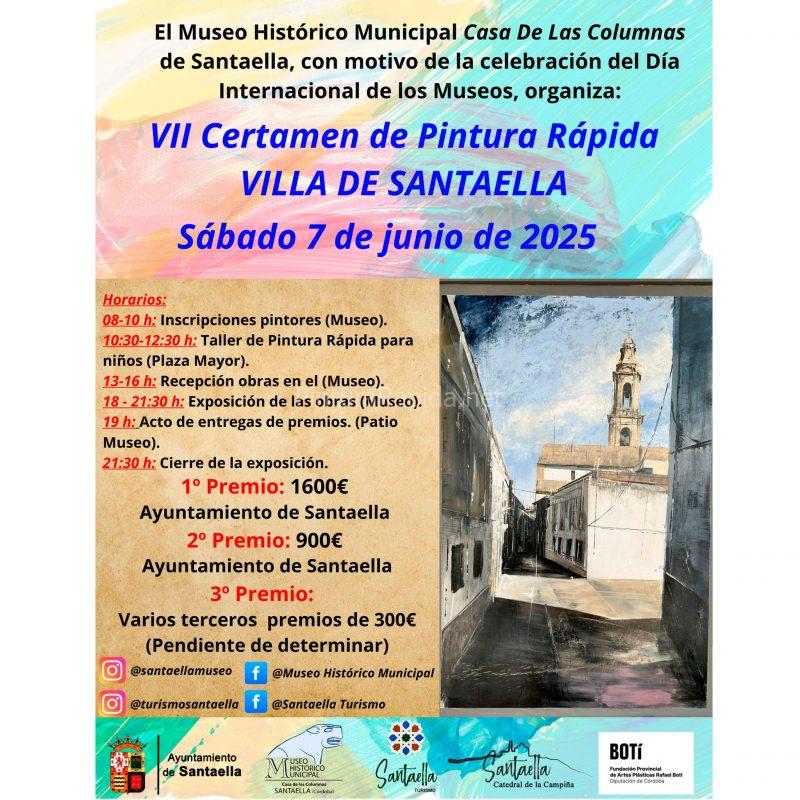 El Museo Histórico Municipal de Santaella y el Área de Cultura y Turismo del Ayuntamiento de Santaella, con motivo del Día Internacional de los Museos, convocan el VII Certamen Nacional de Pintura Rápida al Aire Libre “Villa de Santaella”, que tendrá lugar el día 7 de junio de 2025, sábado, de acuerdo con las siguientes bases:
