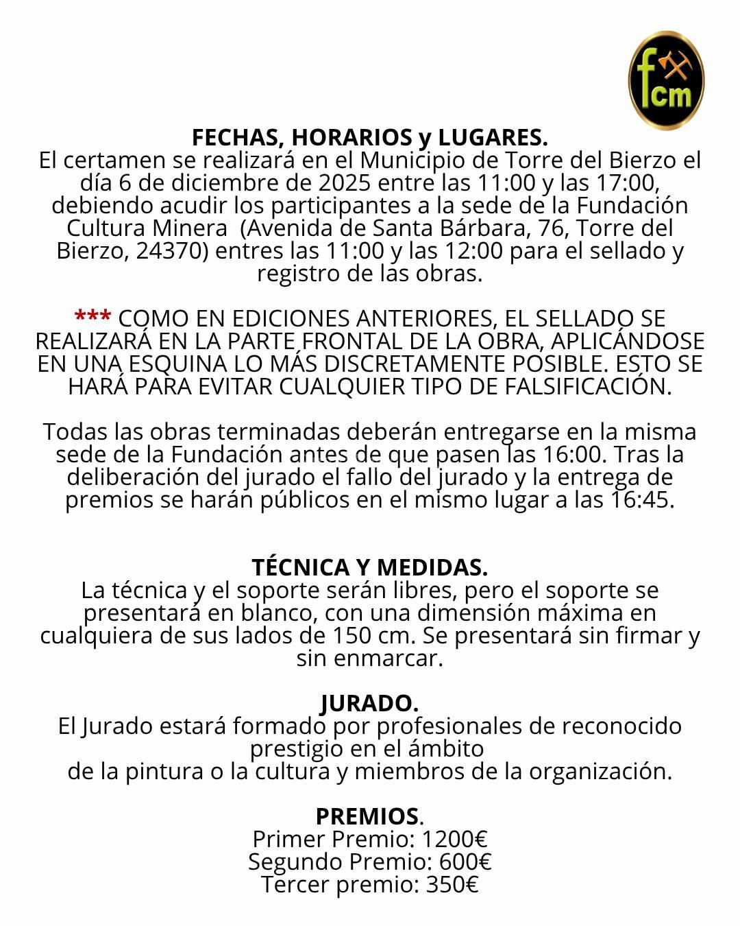 El certamen se realizará en el municipio de Torre del Bierzo el día 6 de diciembre de 2025 entre las 11:00 y las 17:00, debiendo acudir los participantes a la sede de la Fundación Cultura Minera (Avenida de Santa Bárbara, 76, Torre del Bierzo, 24370) entre las 11:00 y las 12:00 para el sellado y registro de las obras.