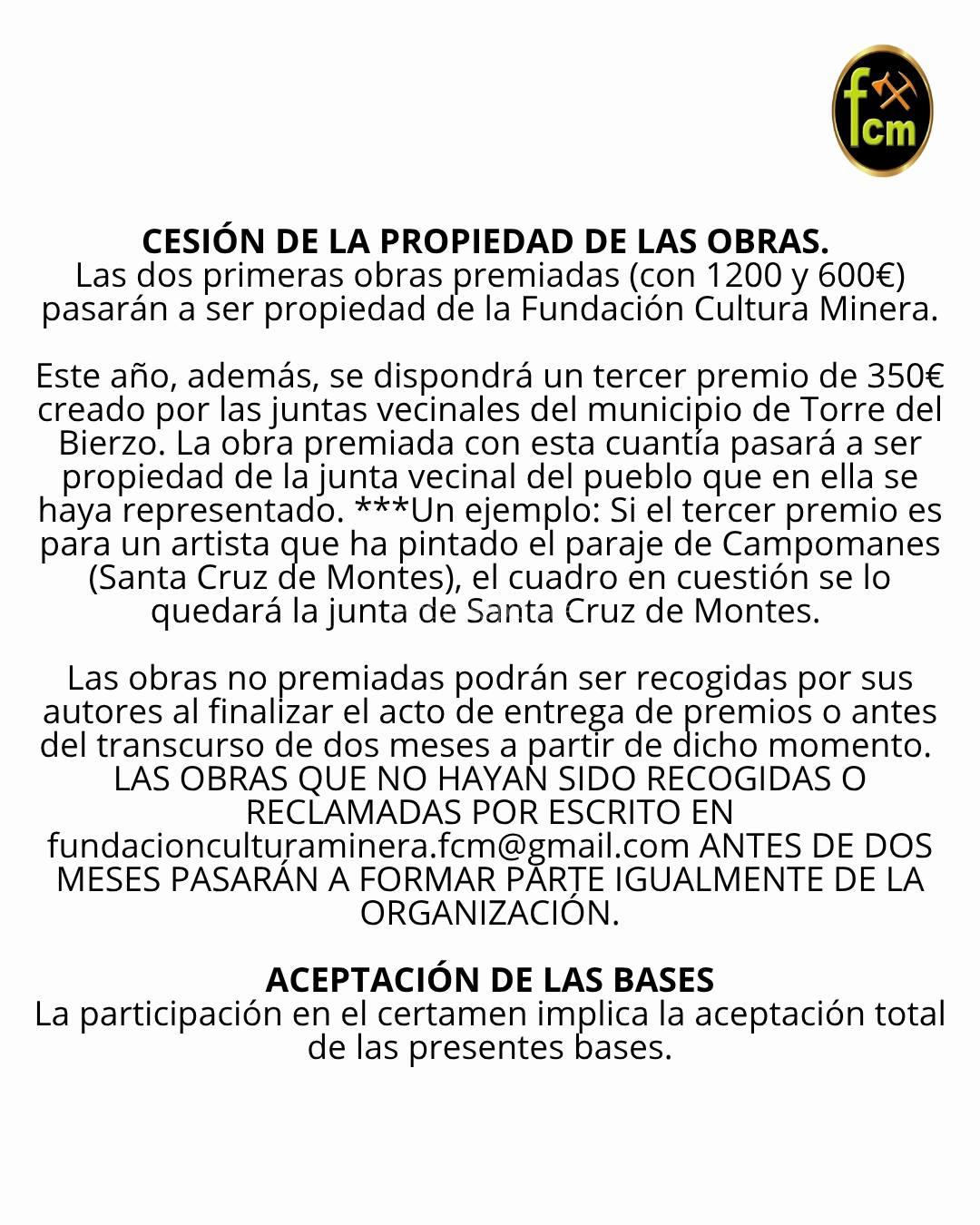 *** Un ejemplo: si el tercer premio es para un artista que ha pintado el paraje de Campomanes (Santa Cruz de Montes), el cuadro en cuestión se lo quedará la junta de Santa Cruz de Montes.