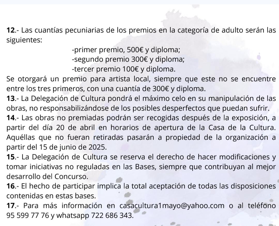14.- Las obras no premiadas podrán ser recogidas después de la exposición, a partir del día 20 de abril en horarios de apertura de la Casa de la Cultura. Aquéllas que no fueran retiradas pasarán a propiedad de la organización a partir del 15 de junio de 2026.