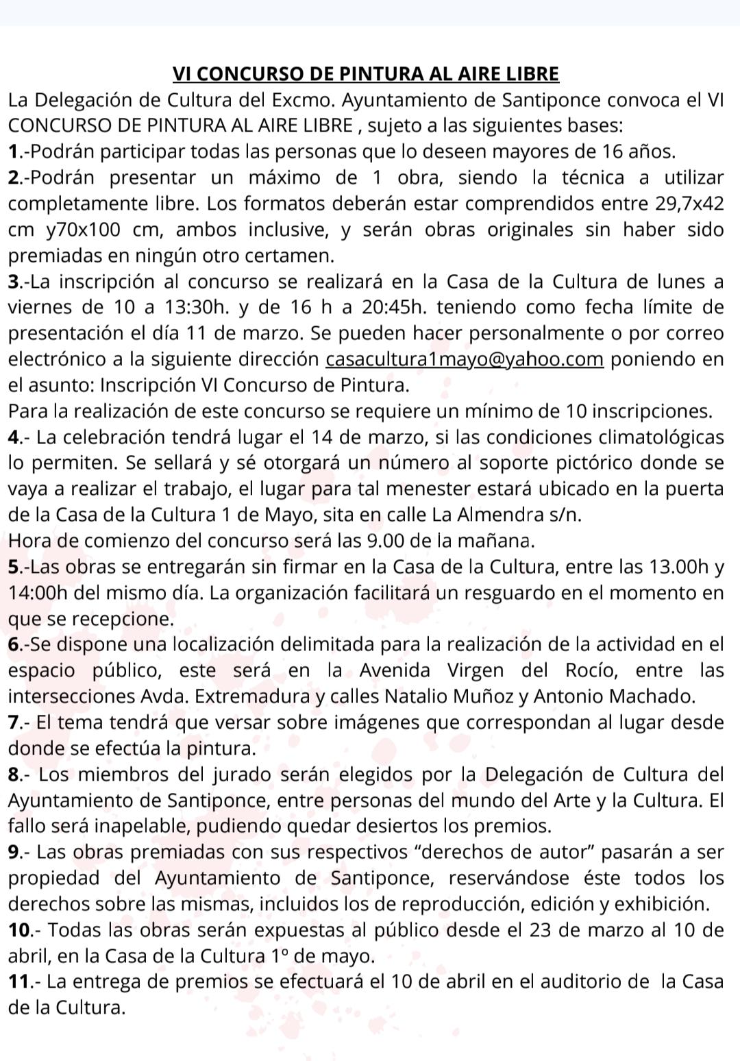 4.- La celebración tendrá lugar el 14 de marzo, si las condiciones climatológicas lo permiten. Se sellará y se otorgará un número al soporte pictórico donde se vaya a realizar el trabajo, el lugar para tal menester estará ubicado en la puerta de la Casa de la Cultura 1 de Mayo, sita en calle La Almendra s/n. Hora de comienzo del concurso será las 9:00 de la mañana.